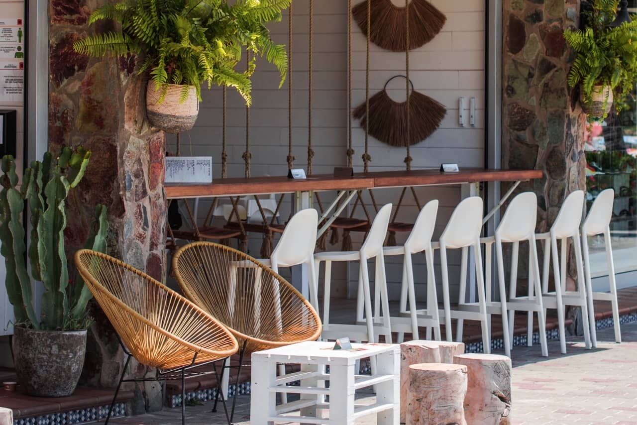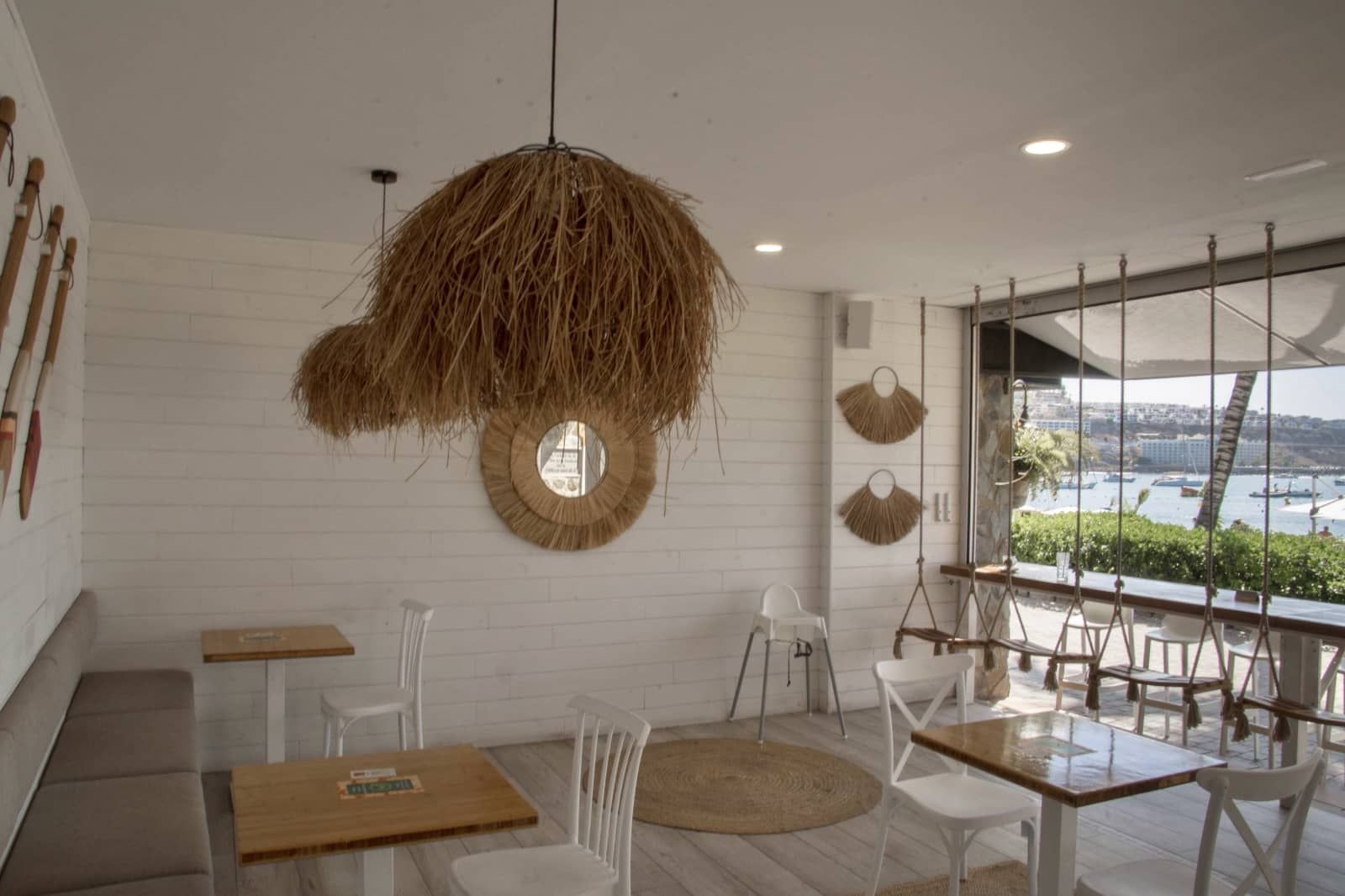 El local cuenta con 10 mesas interiores, 2 mesas exteriores en el paseo y una barra terraza con 6 columpios y magníficas vistas a la playa.
